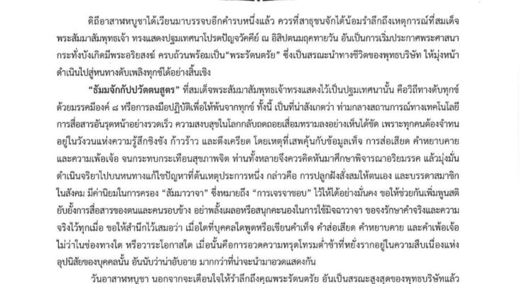 วันอาสาฬหบูชา นอกจากจะเตือนใจให้รำลึกถึงคุณพระรัตนตรัย อันเป็นสรณะสูงสุดของพุทธบริษัทแล้ว ยังอาจเตือนใจให้ทุกท่าน ตระหนักแน่วแน่ในอริยมรรคข้อ สัมมาวาจา เพราะฉะนั้น หากท่านประสงค์ให้สังคมไทยร่มเย็นเป็นสุข จงหมั่นเพียรศึกษาอบรมและปฏิบัติธรรมะ มีน้ำใจกล้าหาญที่จะละทิ้งมิจฉาวาจา เพื่อให้ทุกครอบครัว และทุกชุมชน เป็นสถานที่ปลอดจากการหลอกลวง การวิวาทบาดหมาง และความตึงเครียด นับเป็นการเกื้อกูลตนเอง และสรรพชีวิตทั่วหน้า ให้สามารถพ้นจากภยันตรายได้สมตามความมุ่งมาดปรารถนาอย่างแท้จริง อนึ่ง ขอความเจริญงอกงามในพระสัทธรรม จงพลันบังเกิดมีแด่สาธุชนผู้มีวาจาชอบ โดยทั่วหน้ากัน เทอญ